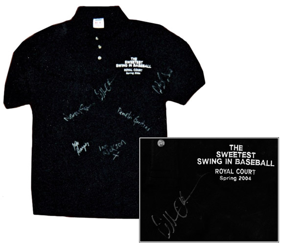 Signed by Gillian Anderson and the whole cast of "The Sweetest Swing in Baseball". This t-shirt is from a limited edition of high quality black polo t-shirts that were sold during the May 2004 run of SSiB in London. "The Sweetest Swing inBaseball Royal Court 2004" is embroidered in white on the left breast.