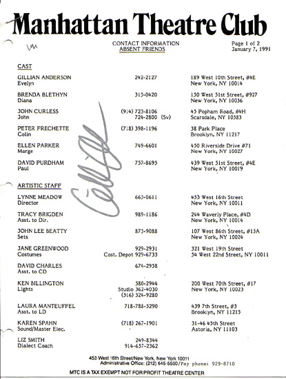 This item was the Manhattan Theatre Club's Contact Information List for the cast and staff of "Absent Friends" by Alan Ayckbourn. This was Gillian's first big break and it won her a Theater World Award in 1991.
