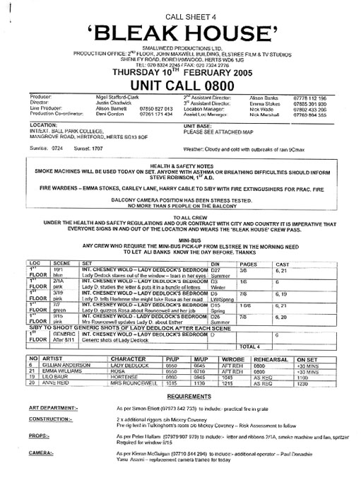 "Bleak House" Call Sheet Packet