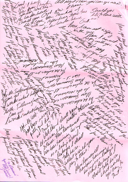 This item is a Bleak House call sheet. It is a ten page packet that includes filming site rules and a production risk assessment. Three pages of the packet contain Gillian's notes on the back (lines from the script written multiple times for memorization purposes) as shown in the second picture below.