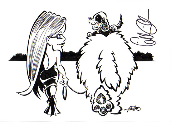 This drawing of Gillian taking a sheepdog for a walk (with little Happy riding piggyback) was donated by Maurizio Di Bona (aka: The Hand), inventor of the rokkartoon. He also creates custom made cartoons. For information on how to be a protagonist in your very own comic strip, click here.