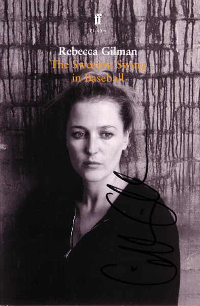 This set includes two flyers and a playtext of The Sweetest Swing in Baseball by Rebecca Gilman. Gillian played the role of Dana Fielding in this play which ran at London's Royal Court Theatre from March 25, 2004 through May 15, 2004. Thank you to Blue for donating these items. The playtext (in book format) is signed by Gillian Anderson and comes with a Certificate of Authenticity from the Official Gillian Anderson Website. include("footer.php") ?> |