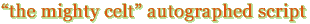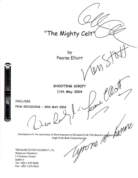 This item is a shooting script (dated May 11th, 2004) for the film The Mighty Celt which recently premiered at the Berlin Film Festival and is scheduled to be released in the UK and Ireland on October 2005. It is a contemporary coming of age tale story set in the world of Greyhound Racing. "It was a fantastic experience all around. I loved the director, producers, actors and crew and I loved Belfast and I think the whole movie is really special and I can't wait to see it. Oh, and everyone on the planet is going to fall in love with the boy who plays my son," Gillian enthused. The script is signed by the movie's cast and writer/director: