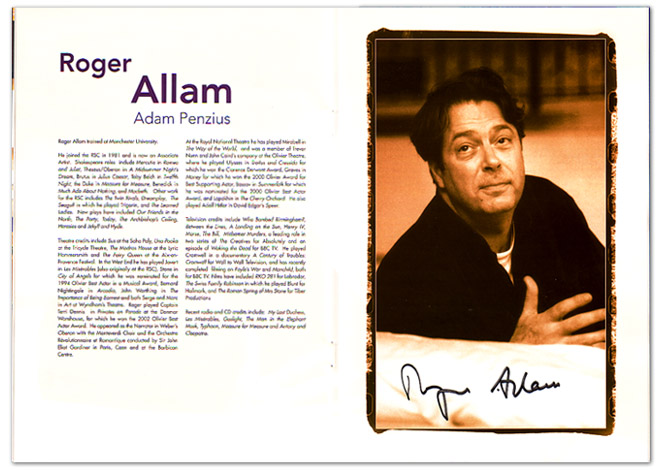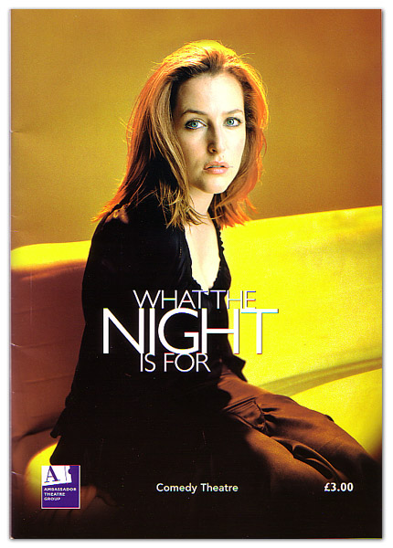 This item is a program for the play What the Night is For, "a two-hander about middle-aged emotional angst" by Michael Weller which ran from November 2002 through February 9, 2003 in London's West End. Gillian and Roger Allam played the roles of Lindy and Adam.