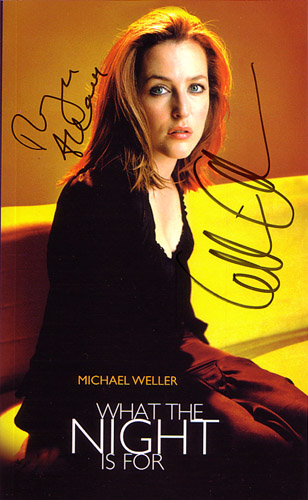 This item is a playtext for What the Night is For, "a two-hander about middle-aged emotional angst" by Michael Weller which ran from November 2002 through February 9, 2003 in London's West End. Gillian and Roger Allam played the roles of Lindy and Adam.