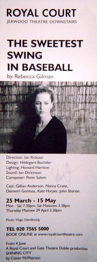Autographed SSiB T-Shirt Signed by Gillian Anderson and the whole cast of "The Sweetest Swing in Baseball". This t-shirt is from a limited edition of high quality black polo t-shirts that were sold during the May 2004 run of SSiB in London. "The Sweetest Swing inBaseball Royal Court 2004" is embroidered in white on the left breast. |