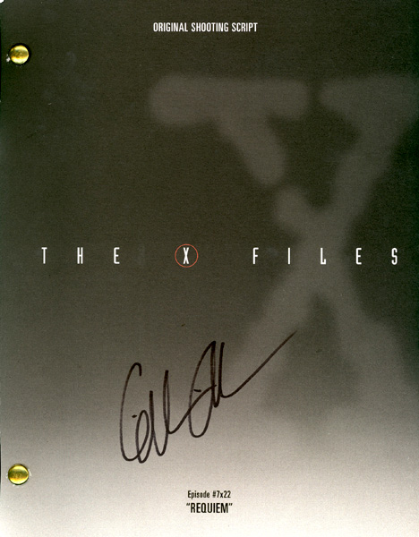 Autographed Requiem script 7X22 TXF episode. Part 1 of 3. Original Air Date: May 21, 2000. Written by Chris Carter. Directed by Kim Manners. Proceeds from this item will benefit the NfA and Buskaid. |