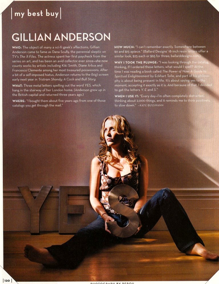 Gillian: "I bought them about five years ago from one of those catalogs you get through the mail. I was looking through the catalog thinking, if I ordered these letters, what would I spell? At the time I was reading a book called The Power of Now: A Guide to Spiritual Enlightenment by Eckhart Tolle, and part of his philosophy is about being present in life. It's about saying yes to the moment, accepting it exactly as it is. And because of that, I decided to get the letters Y, E, and S. ...I'm often completely distracted, thinking about 2,000 things, and it reminds me to think positively, to slow down."