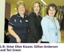The actress and film crew duly arrived and spent several hours on a series of takes, before leaving for their end of shoot party � but not before Gillian had stopped to pose for this picture with Assistant Operations Director, Teri Green and Sister Ellen Kaczor, an Emergency Nurse Practitioner at the Kidderminster MIU.