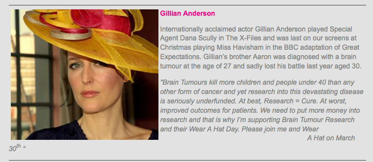 "Brain Tumours kill more children and people under 40 than any other form of cancer and yet research into this devastating disease is seriously underfunded. At best, Research = Cure. At worst, improved outcomes for patients. We need to put more money into research and that is why I�m supporting Brain Tumour Research and their Wear A Hat Day. Please join me and Wear A Hat on March 30th."