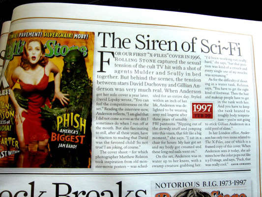 In her London office, Anderson was only two items related to The X-Files, one of which is a framed copy of this cover. When Anderson sees it today, she admires how the color pops out like a 3-D image, and says, "*Bleep*, that was really cool." Vote for your favorite Rolling Stone cover at Rolling Stone's website. Thank you to Philiater for the image.