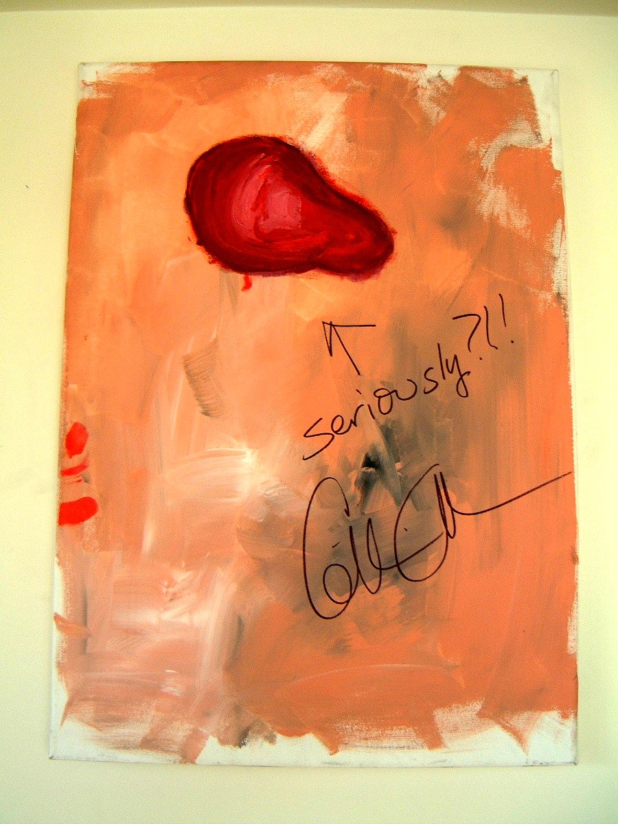 When Gillian was working on The Sweetest Swing In Baseball (25 March 2004 - 15 May 2004), each night she painted a picture on stage adding a little bit more with each performance. Gillian's vibrant and expressionistic work is an oil on canvas measuring 70cm x 50cm (27.5 x 19.7 inches). It's very light and only weighs 900grams (2 lbs.). The painting is in London, England. The winner will have to email The Royal Court Theatre at develop@royalcourttheatre.com for payment instructions and shipping fees. They will accept cheques or credit cards. Click here to access our eBay page. Please keep in mind that the money raised from this auction goes towards helping The Royal Court Theatre. "The Royal Court receives public subsidy, but it is only sufficient to enable us to stage 12 plays a year, whilst in reality we produce around 20 full productions annually. Donors and sponsors provide vital support in enabling us to sustain and develop our work with writers and to produce their plays in our two auditoria." -- Support the Royal Court Auction ends on July 22.