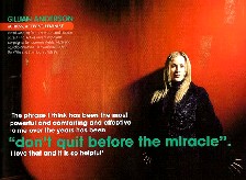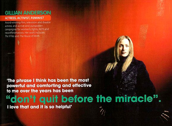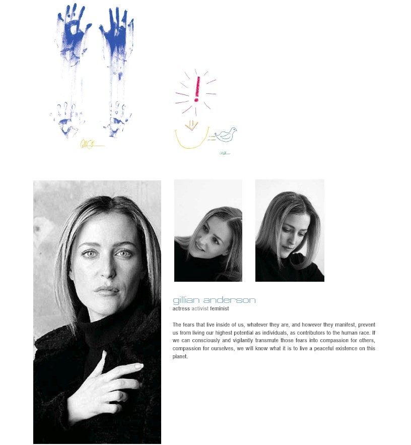 A Cock and Bull Story at the San Sebastian International Film Festival Posted at 6:21 PM (PDT) on Friday, August 12, 2005 ![]() A Cock and Bull Story has been included in the Official Selection of the San Sebastian International Film Festival: September 15-24 Tristram Shandy: A Cock and Bull Story At Toronto Film Festival Posted at 10:58 AM (PDT) on Wednesday, August 10, 2005 ![]() Toronto International Film Festival The Mighty Celt: Shadows on the Wall Review Posted at 9:56 AM (PDT) on Wednesday, August 10, 2005 ![]() Review by Rich Cline The Mighty Celt Review (BBC) Posted at 9:48 AM (PDT) on Wednesday, August 10, 2005 Reviewed by Neil Smith 04 August 2005 BBC Movies Review Gillian Anderson brings a dash of Hollywood glitz to The Mighty Celt, a gentle rites-of-passage tale about a Belfast boy with a passion for greyhound racing. Directed by Pearse Elliott, scripter of last year's Man About Dog, it's a slight and rather dour tale with images of (simulated) animal cruelty that will have pooch lovers foaming at the mouth. That said, it's refreshing to see a flick from the top half of the Emerald Isle that doesn't focus exclusively on the troubles and their aftermath. Billed as "the first post-conflict film to come out of Northern Ireland", Elliott's drama revolves around Donal (Tyrone McKenna), a resourceful lad who juggles school with after hours work for tough-as-nails dog owner Good Joe (Ken Stott). After saving an unpromising mutt from his employer's knife, Donal dubs him The Mighty Celt after one of his favourite comicbook heroes and trains him to beat all comers on the track. Meanwhile, single mother Kate (Anderson, looking decidedly un-glam and sporting a perfect Ulster brogue) gets gradually reacquainted with O (Robert Carlyle), a former boyfriend and reformed terrorist who has returned from exile to rebuild his life. "THE ROMANCE REAPS RICH DIVIDENDS" As a writer Elliott romanticises both Donal's grinding poverty and O's balaclava past, while a subplot involving Real IRA gun-runners is left bafflingly unexplored. But the unlikely romance that develops between Dana Scully and Hamish Macbeth reaps rich dividends. And mischievous newcomer McKenna - despite boasting an accent that could easily cut glass - gives an eye-catching performance loaded with promise. The Mighty Celt is released in UK cinemas on Friday 26th August 2005. Thanks Norma and Wendy! Hands That Shape Humanity Posted at 10:39 AM (PDT) on Monday, August 8, 2005 ![]() Hands That Shape Humanity strives to extract the unique characteristics that have enabled the participants to achieve their success and to distil these traits into qualities, practices and approaches that any of us can use to improve ourselves and contribute towards creating a better society. At the same time, part of the proceeds raised through the Hands That Shape Humanity initiative go towards the Desmond Tutu Peace Centre in order to help further the DTPC's goals and objectives. Ordinary People, Extraordinary Lives The first phase of the Hands That Shape Humanity exhibition comprises words of wisdom, and shared thoughts and insights on humanity and what shapes it, from 38 high profile people, from all over the world and from all walks of life. Gillian Anderson: The first Hands That Shape Humanity Exhibition was launched on the 25th of November 2004 in Cape Town, South Africa - the hometown of the patron of HTSH, Emeritus Archbishop Desmond Tutu. Due to the fantastic response, the initial 3 months exhibition has been extended to 12 months. HTSH will soon embark on a global road-show as it is hosted in cities around the world throughout the Americas, the UK & Europe and Asia-Pacific. Appropriate venues are currently being sourced. A permanent exhibition will also be housed in the Desmond Tutu Museum of Peace that commences construction in 2006 on the Foreshore in Cape Town, South Africa. Take a virtual tour of the exhibition. Read more at Marie Claire and Kulula. Click HERE to view an 8 page PDF article. 624k