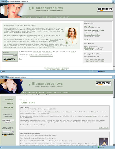 If you're using one of these viewing methods and experience any difficulties with the new layout, please contact us right away so that we can fix the problem. A few sections are coming soon: Gillian's favorites, the store, and video clips. We hope to have these up and running within the next week. Also, there may be some minor changes, fixes, and improvements made within the next few days, so please bear with us. Thank you for your patience, and enjoy! New Book Mentions Gillian Posted at 3:35 PM (PDT) on Tuesday, September 9, 2003